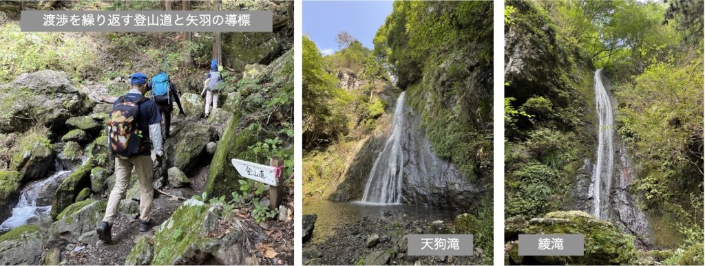 北秋川の千足バス停で降り「関東ふれあいの道/天狗滝・綾滝」の道標を確かめて登山を開始しました。車道を300m進んだところに公衆トイレがあり、集落を越えると渓流に沿って登山道が続きます。飛び石の上に乗って何回か渡渉を繰り返すと「小天狗の滝」「天狗の滝」を見ながら、さらに見応えのある「綾滝」に着きます。ここで先週の「槇寄山」で教えてもらったクマ対応の爆竹を「パン!パン!パン!」と3つ鳴らしました。その後も何回か鳴らしながら歩きました。