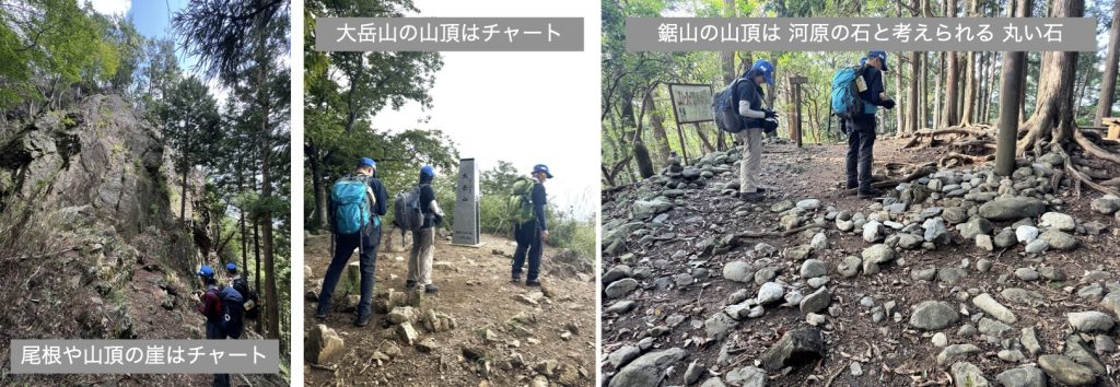滝のある崖や「つづら岩」「鋸山」の山頂に見られる岩石について、地形と地質(岩石)の関係を観察しました。ゴツゴツした岩石で覆われている山頂や険しい岩場が続く稜線の岩石はチャートいう岩石です。チャートはたいへん硬い岩石で、鉄より硬いので釘で擦っても傷がつきません。砂や泥の岩石よりも硬いチャートの岩石のあるところは、風化されにくいために山頂やゴツゴツした稜線という地形になったというわけです。そしてチャートという岩石から、日本列島の歴史に関するプレートテクトニクスのことまで話題になってしまいました。
