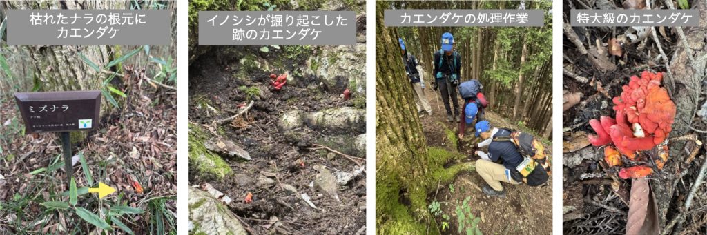 ナラ枯れの被害は大岳山でも深刻な問題です。大きな木が立ち枯れていて落枝や倒木の心配があります。さらに近年はカエンダケが大発生しており、発見したものは危険のないようにしっかり処分しています。しかし今回は数が多すぎて全てを処分することができませんでした。イノシシが掘り返したところにカエンダケが大量に残されていました。この様子からイノシシはカエンダケを食べていないことが想像できます。カエンダケの恐ろしさはイノシシなどの動物にも知れ渡っているようです。