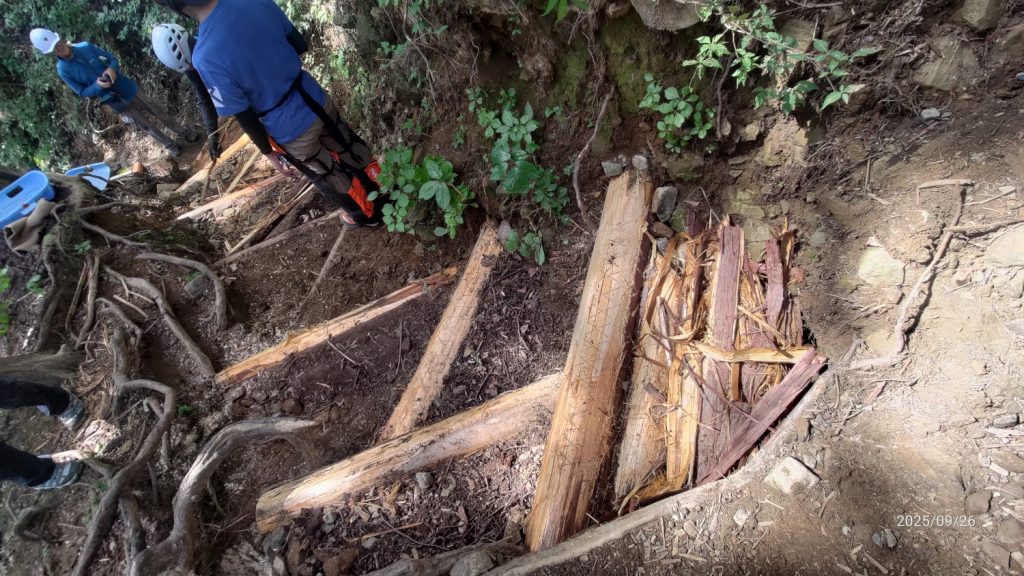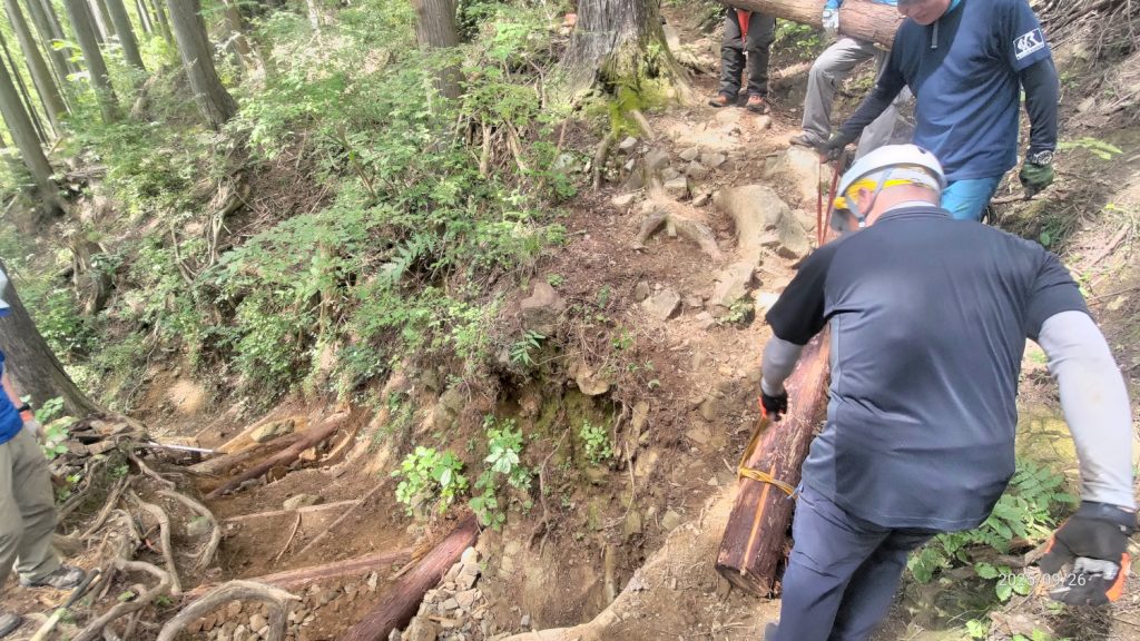 資材は間伐材を用いますが現場までは手運びです。計7本の丸太運びが一番辛かったかも。