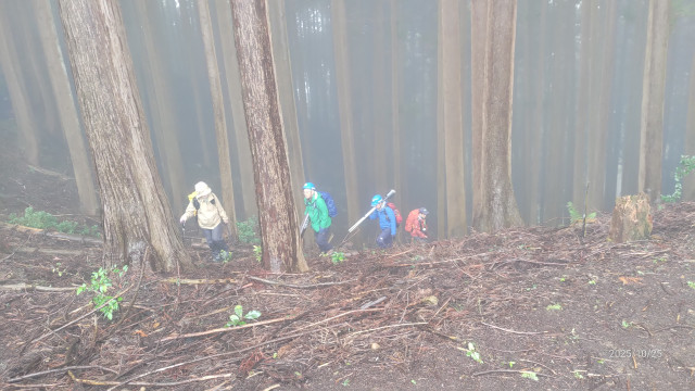 小雨の中、樹林帯の登山道は雨の影響はさほど感じませんでしたが、琴平神社へ向かう下り道は、ガスがかかっているうえに滑りやすい箇所が多く、慎重に移動しました。