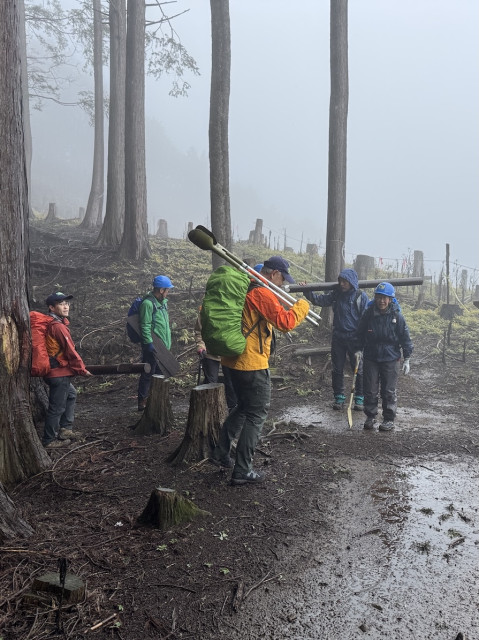 小雨の中でしたが、古い指導標の除去作業や穴掘りに大きな支障もなく、また気温も低く集中して作業ができたため、1時間程度の作業時間で設置が完了しました。その後、琴平神社付近で全員で昼食をとった後に梅野木峠付近に戻り、公用車で御嶽駅のレンジャー詰所まで戻り、無事、解散しました。