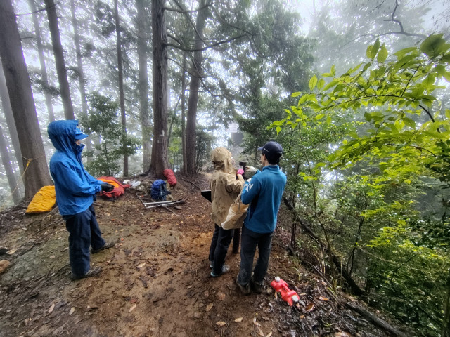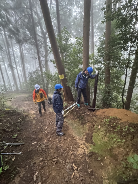 小雨の中でしたが、古い指導標の除去作業や穴掘りに大きな支障もなく、また気温も低く集中して作業ができたため、1時間程度の作業時間で設置が完了しました。その後、琴平神社付近で全員で昼食をとった後に梅野木峠付近に戻り、公用車で御嶽駅のレンジャー詰所まで戻り、無事、解散しました。
