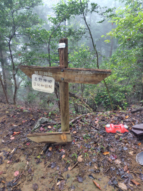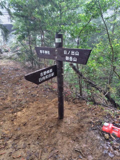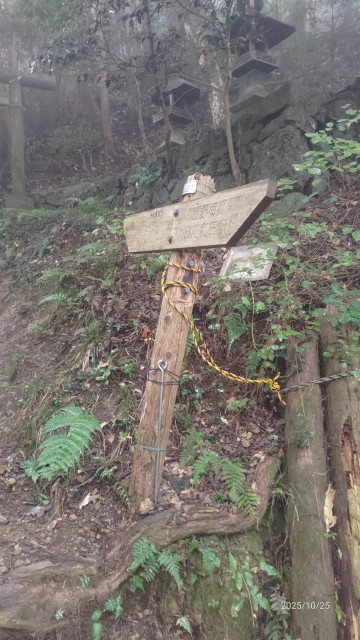 小雨の中、樹林帯の登山道は雨の影響はさほど感じませんでしたが、琴平神社へ向かう下り道は、ガスがかかっているうえに滑りやすい箇所が多く、慎重に移動しました。