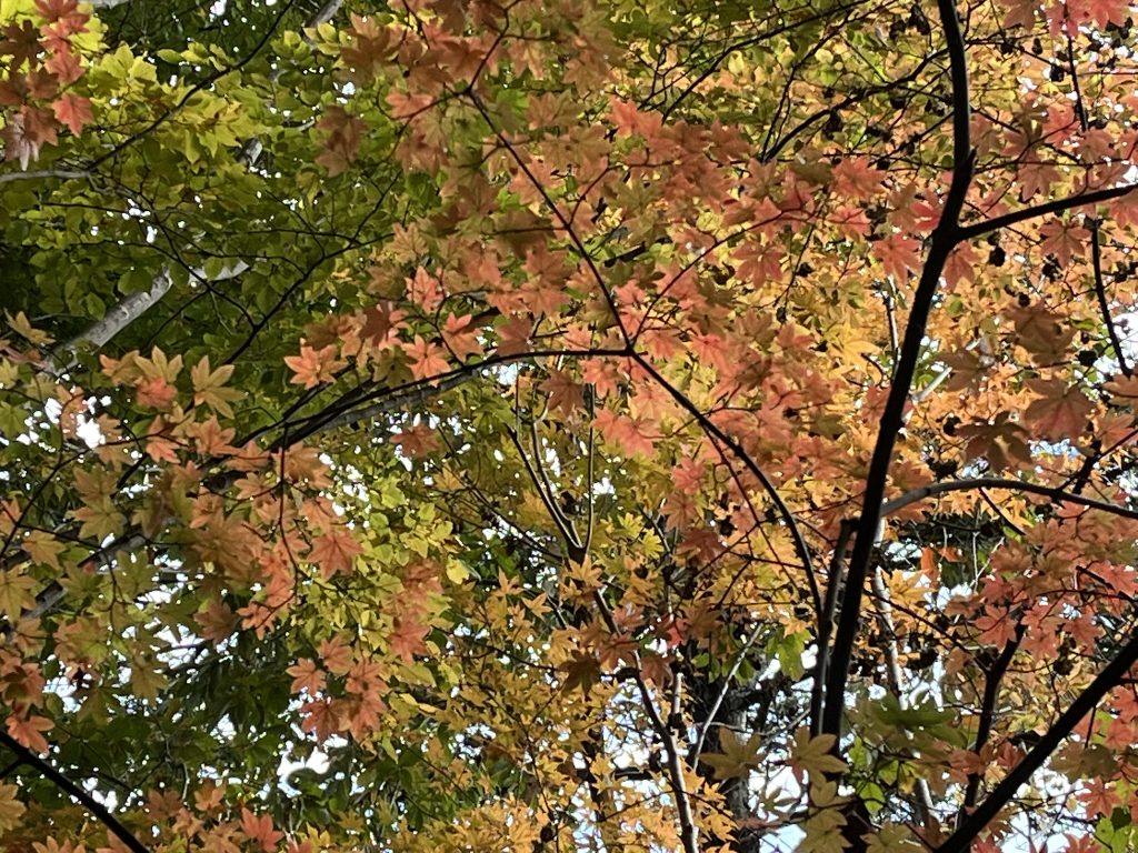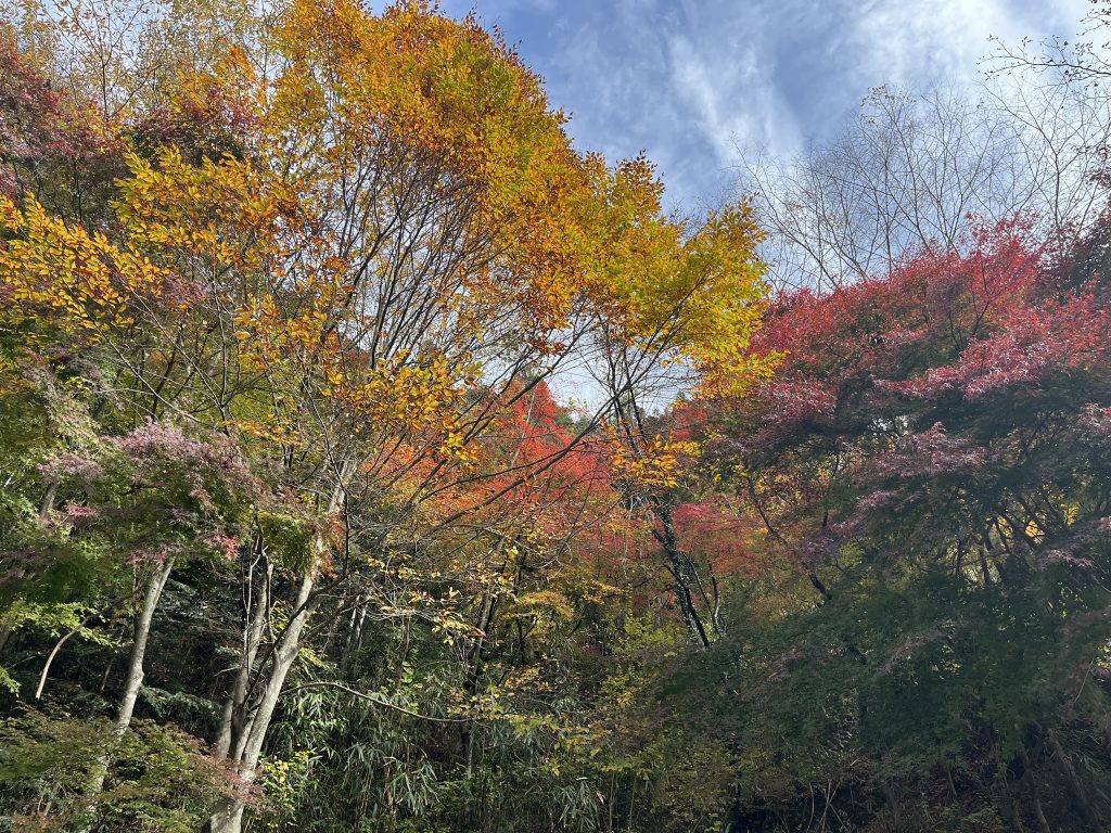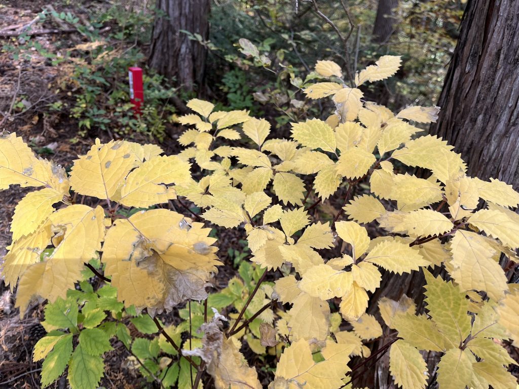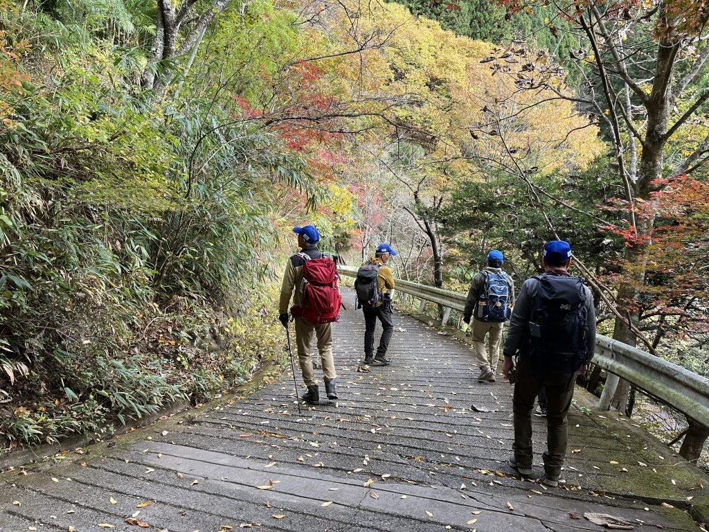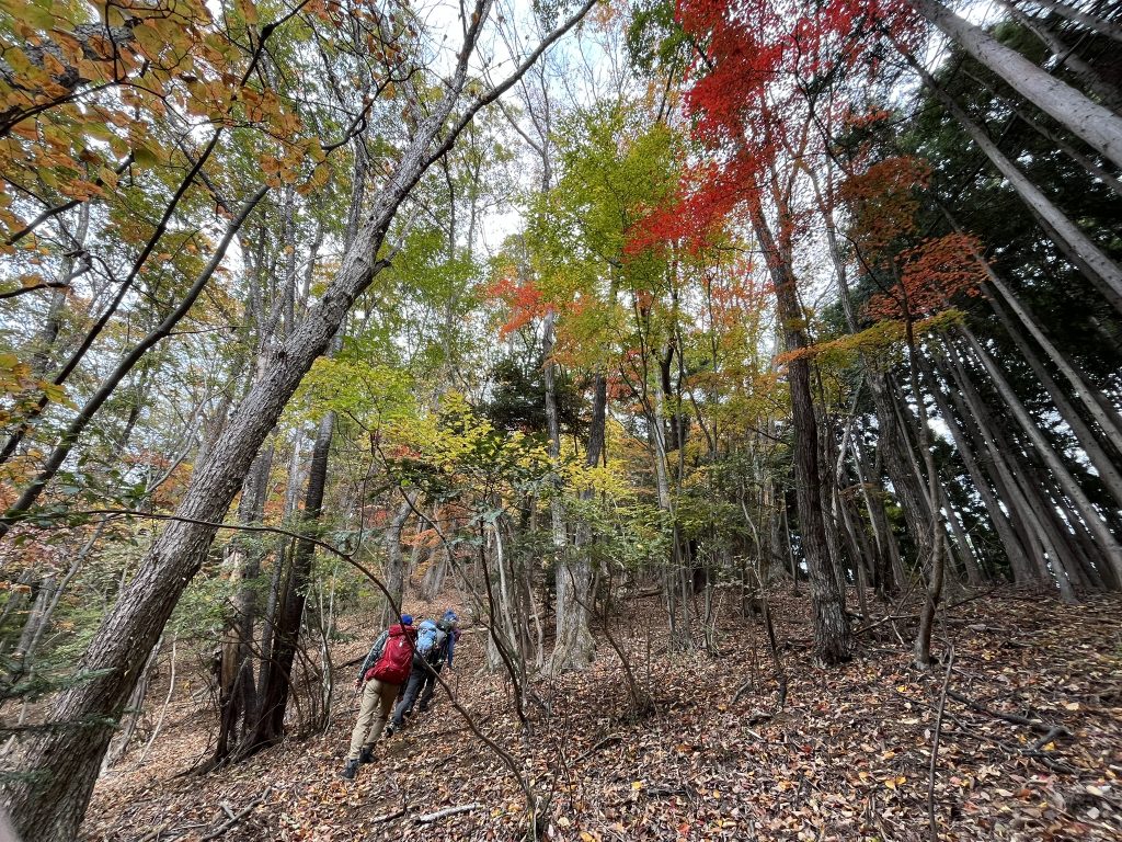 仲の平バス停近くのトイレ付近で出発準備。すでに紅葉が広がっています。
