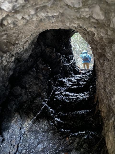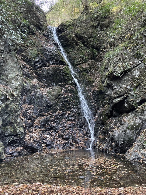 先の指道標から200mで金剛滝に至りますが、先ず岩のトンネルを潜って金剛滝の前に出ます。