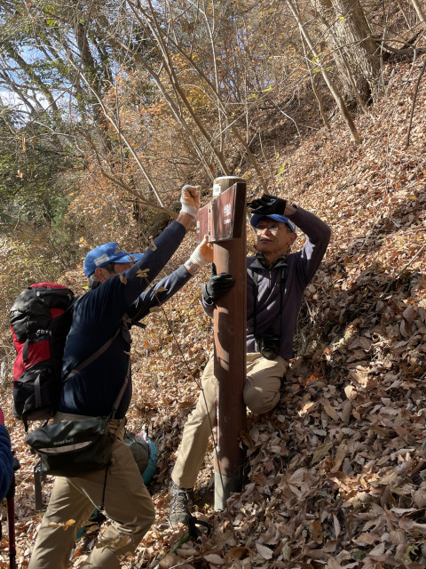 谷底の指道標は、苔むしていて念入りに清掃しました。