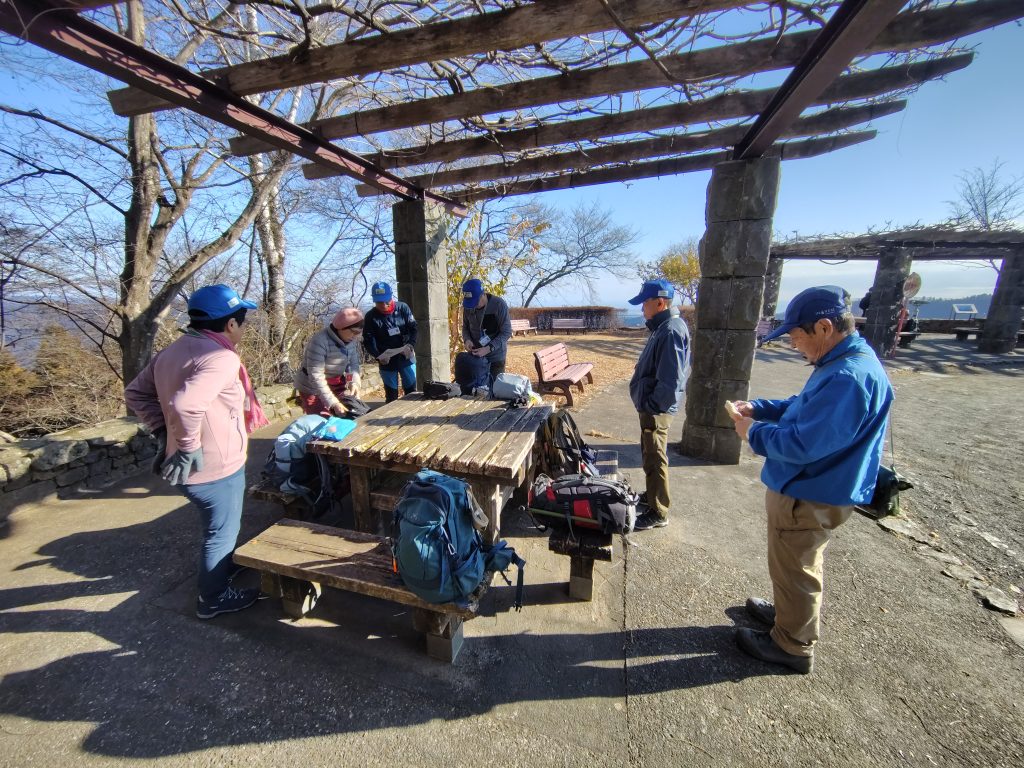 ロックガーデンにある休憩舎にて昼食をとりました。冬は樹木の葉が少ないため、あちこちで野鳥の観察が比較的容易にできましたが、この場所でも野鳥の鳴き声が多く聞こえ、身近に観察することができました。昼食後は、ゴミ拾いだけでなく、案内板の裏表をしっかり清掃しました。