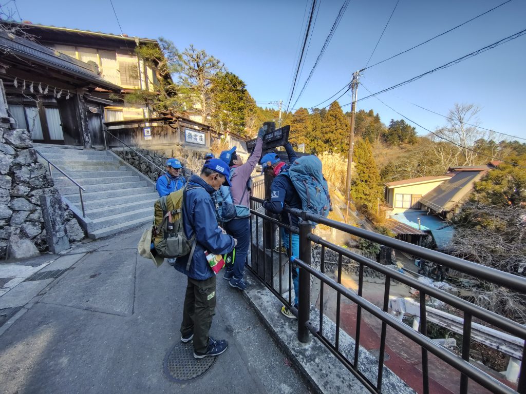 まずは武蔵御嶽神社手前で、いくつかの指導標のメンテナンスを実施。矢羽根の緩みを二人がかりで締め直しました。裏側のナットを押さえながら、表側のボルトを締めるため、二人がかりでの共同作業です。登山者の安全につながる重要な指導標ですので確認とメンテナンスは欠かせません。
