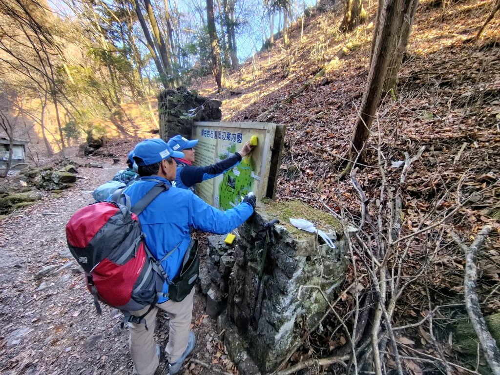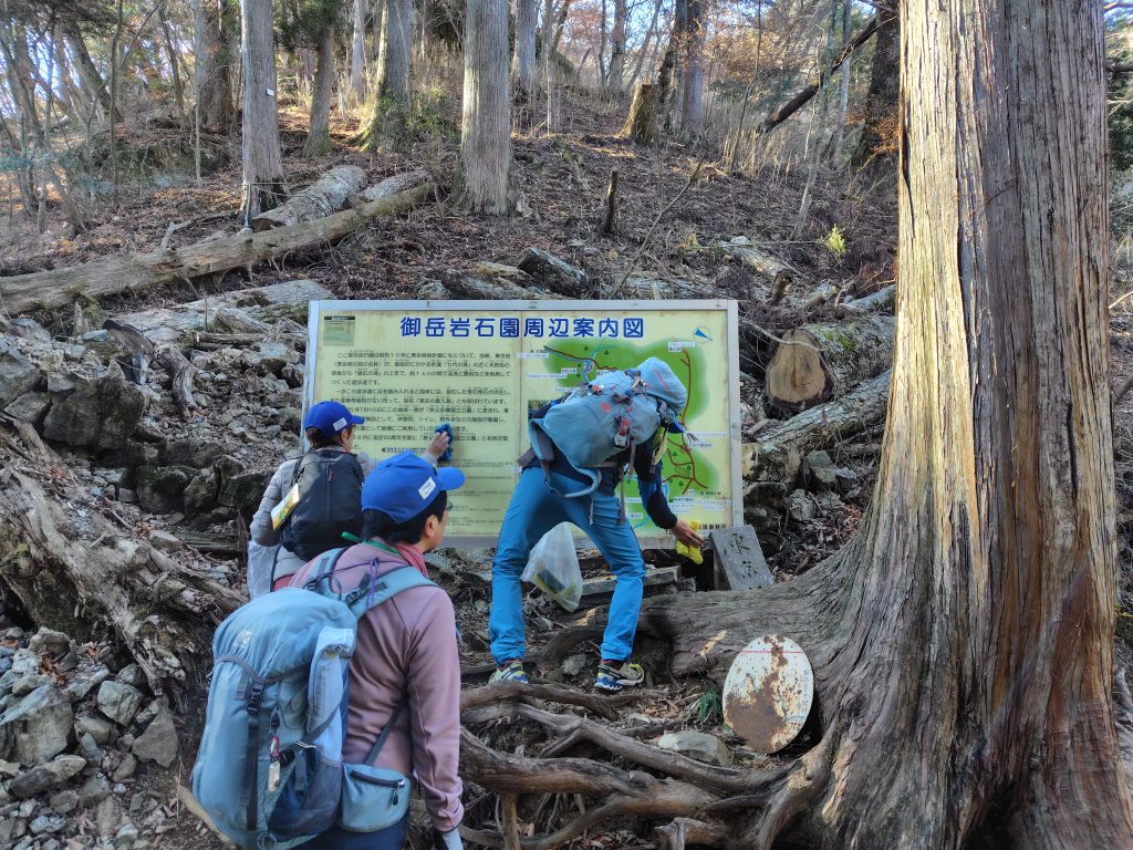 武蔵御嶽神社下の案内板の清掃も実施しました。案内板は雨風などでどうしても汚れてしまうので、定期的な清掃が欠かせません。