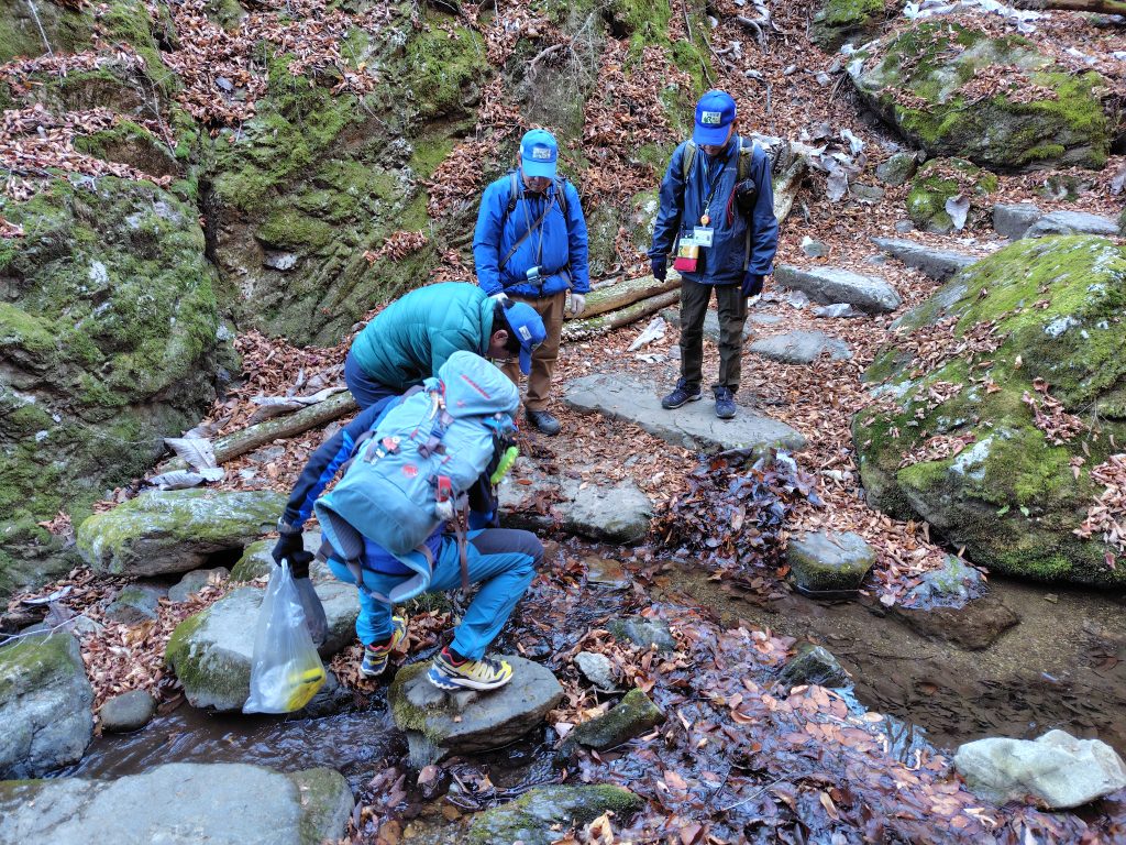 ロックガーデン内にある水路に大量の落ち葉が堆積し水の流れが悪くなっていたため、落ち葉だけでなく石も動かして、水の通りを改善しました。ここでは、メンバーの一人が持参した「トング」が大活躍しました。巡視活動では、ちょっとした道具が、大いに役立ちます。