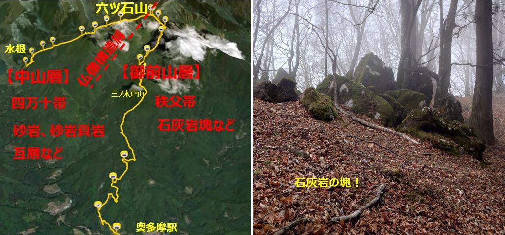 仏像構造線に対し、六ツ石山の水根側は四万十帯の中山層。登ってくる間、砂岩などが主に見られた一方、三ノ木戸山側はより時代が遡る秩父帯の御前山層。石灰岩の塊が多く見られました。文字通り、「石尾根」であることを確認できました。
