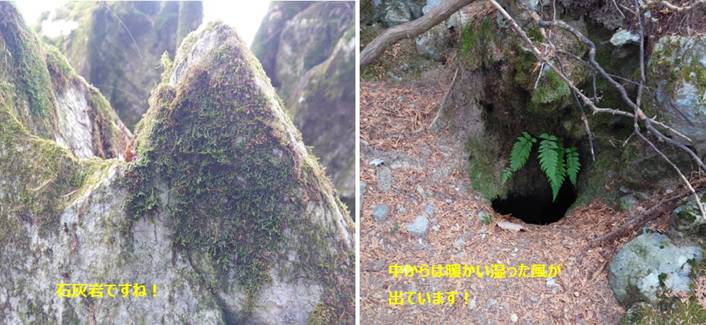 また、石尾根途中、穴があるところがありました。中は暖かく湿っている風が、地上に吸い出されているようです。石灰岩なので、中が水で溶け(酸性雨)鍾乳洞化しているのかも!と想像が膨らみました!!