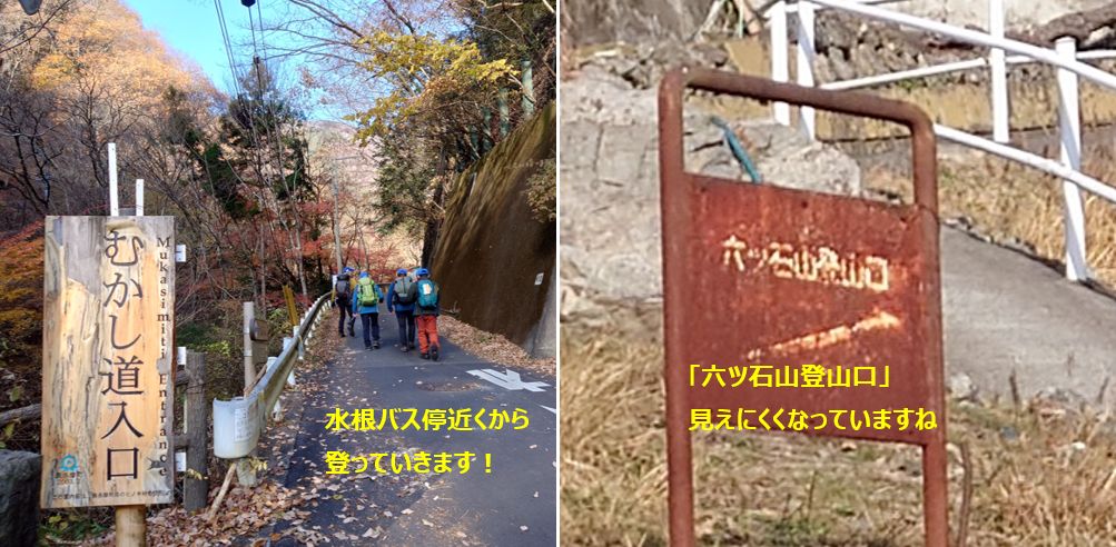 水根バス停近くの「むかし道入口」から登って行きます。しばらく歩くと、「六ツ石山登山口」の看板が出てきます。錆で見づらくなっているので、見落とさないように!