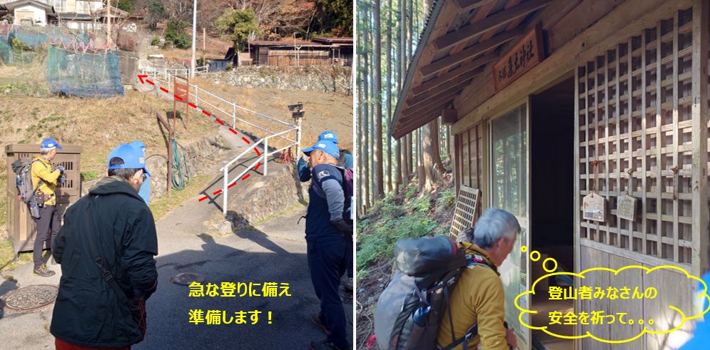 登りはじめて少し行くと、左手に産土(うぶすな)神社が見えます。山の安全、土地の平安を司る大山祇命(おおやまづみのみこと)を主神とし、脇宮に愛宕神(防火)、稲荷神(豊作)、金山彦社(山の資源)、疱瘡神(疫病除け)の四神も合祀されているそうです!