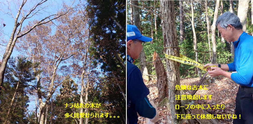 ナラ枯れの危険な古木に注意喚起(黄色テープ、立入禁止)をします。危険なのでロープの中に入ったり、危険な古木の下で休憩をとらないようにしてくださいね!いつ、上から古木が落ちてくるかわかりません。。。