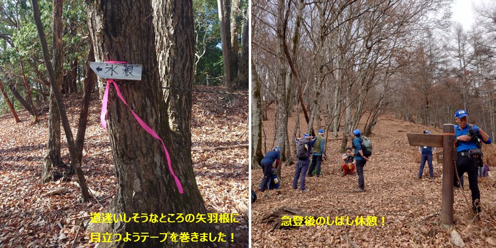 道迷いしそうなところは、そして見落としそうな白い矢羽根の近くに、目立つようにピンク色のテープを巻いておきました(なびいているはず!)。気づいてくれるとうれしいですね。実際、このあたりで道迷いがあったという話が、サポートレンジャー(SR)メンバーから共有がありました。この時期、枯れ葉が大量に落ちると、道筋もわかりにくくなりますね。長かった急登が終わり、トオノクボで休憩です!