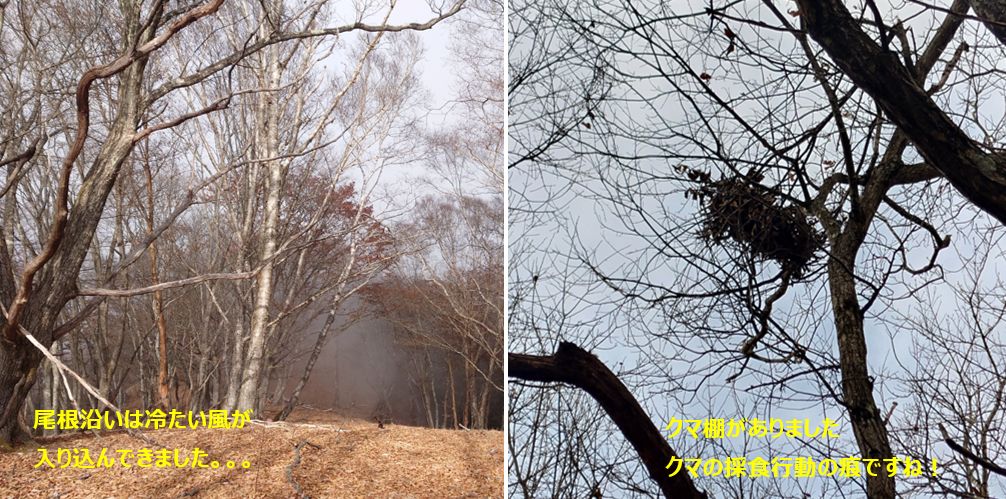 トオノクボからの尾根は、冷気が入ってきて、かなり気温が下がってきました。明日からの寒気の影響でしょうか。。。しばらく進むと、榛ノ木尾山あたりで、クマ棚がありました。採食行動の痕ですね。枝先に結実した枝をたぐりよせて採食。折れた枝が積み重なって、鳥の巣のようになるのだそうです!