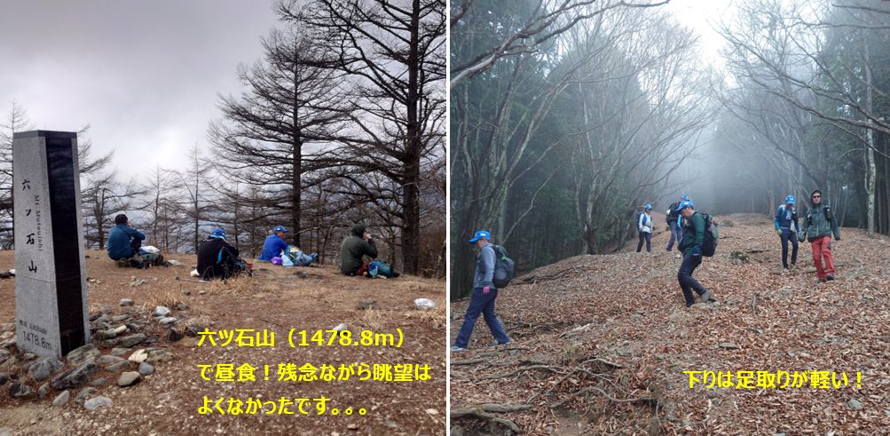 六ツ石山で昼食です。朝は晴れていたのですが、すっかり曇りに。眺望はよくなかったです。残念!この先の工程は、ほぼ下りになります。足取りがみな軽い!
