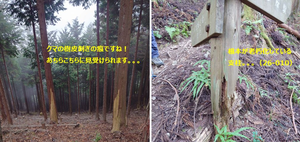 また、ほとんどの道標の、支柱への矢羽根締結ボルトが緩んでいました。増し締めできるものは、その場で処置(一部、錆で回らないボルトはそのままもあり)。根本が老朽化で折れそうなものもありました(26-010)!