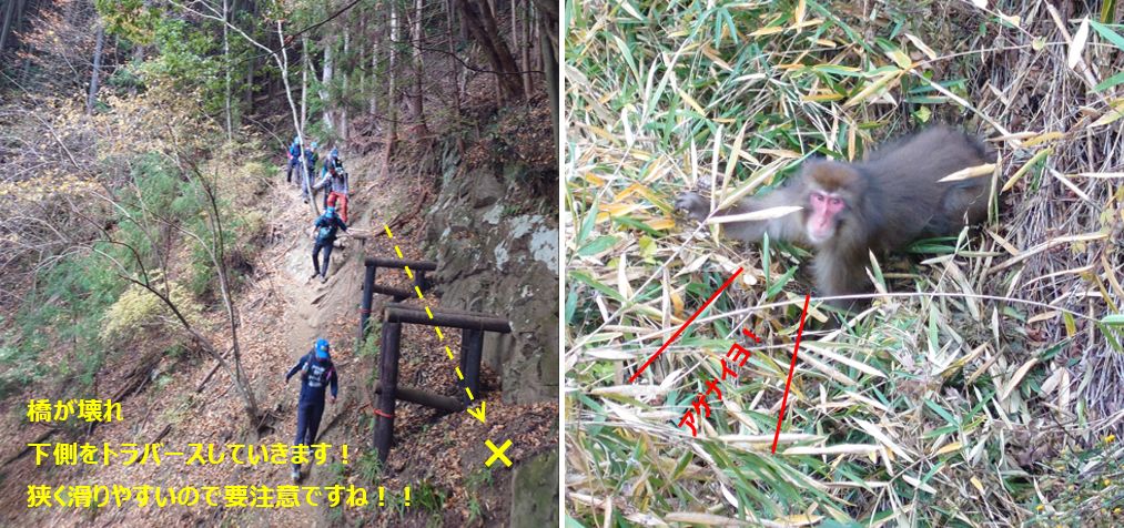 稲荷神社の付近の橋が崩れ、下側をトラバースするところもありました。滑りやすいので、慎重に通行します。また、羽黒三田神社を過ぎたところで、サルのたちに出会いました。草むらの中で、何やら物色している模様。刺激しないように、さっと抜けます。そして、奥多摩駅へゴール。全員無事で巡回終了しました!
