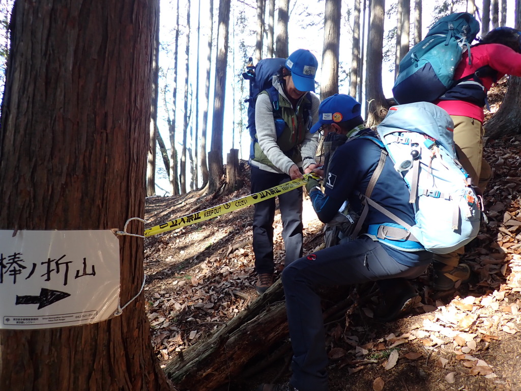 登山道と間違えて迷い込みそうな箇所には粗朶とテープで注意喚起