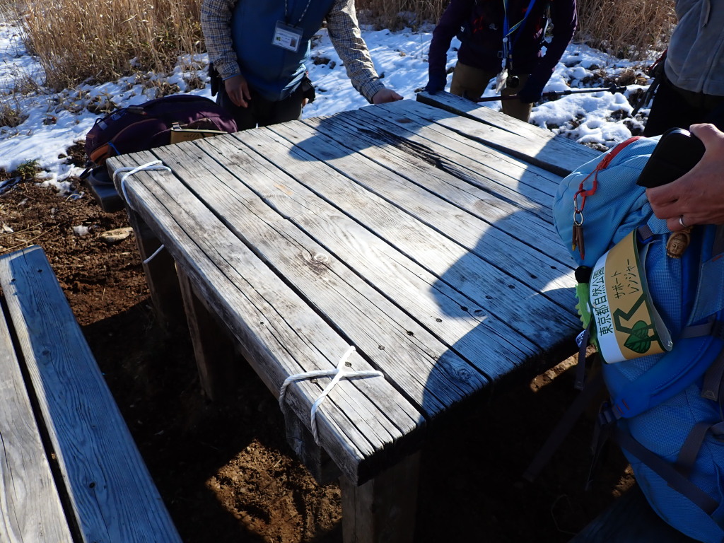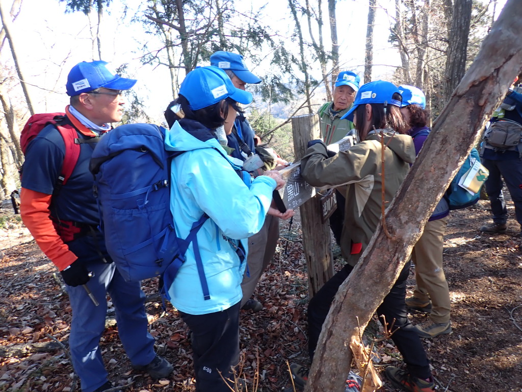 の説明でコースの岩石を観察、そして快晴の山頂では北面の眺望が楽しめ、冬の一日を