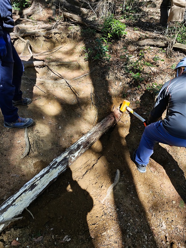 今回は雨による浸食で生じた段差の解消と土砂の流出防止の土留めの設置が目的です。