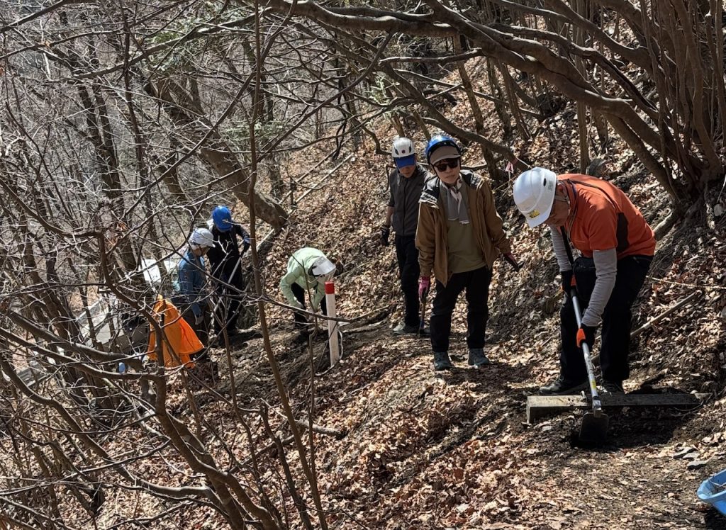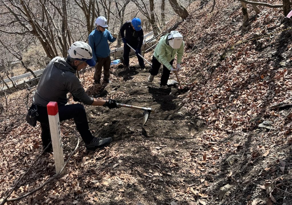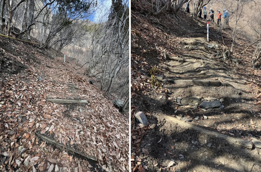 2月でも南斜面の落葉樹林は暖かくて楽しい作業でした。鷹ノ巣山の登山口(奥集落)のザレている歩道を整備しました。
