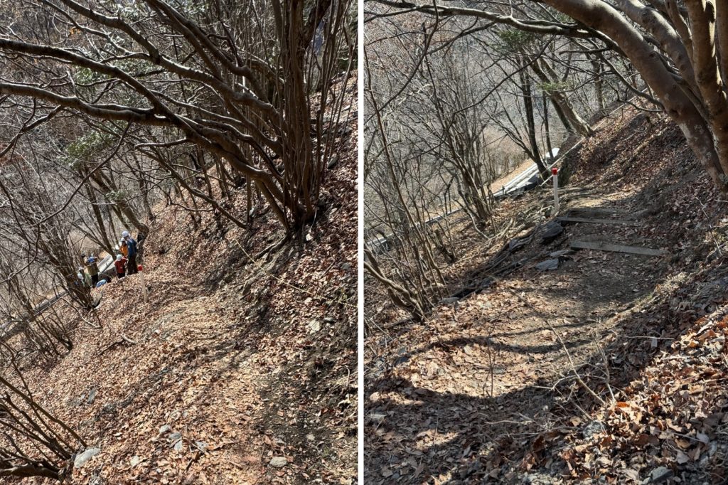 急斜面に小石や落ち葉が積もっていて滑りやすくなっています。登り始めは元気があって心配ないと思いますが、長い下りを歩いてきた足にとっては、最後の急斜面が要注意です。最後の一歩まで安全に下山することを願って整備しました。