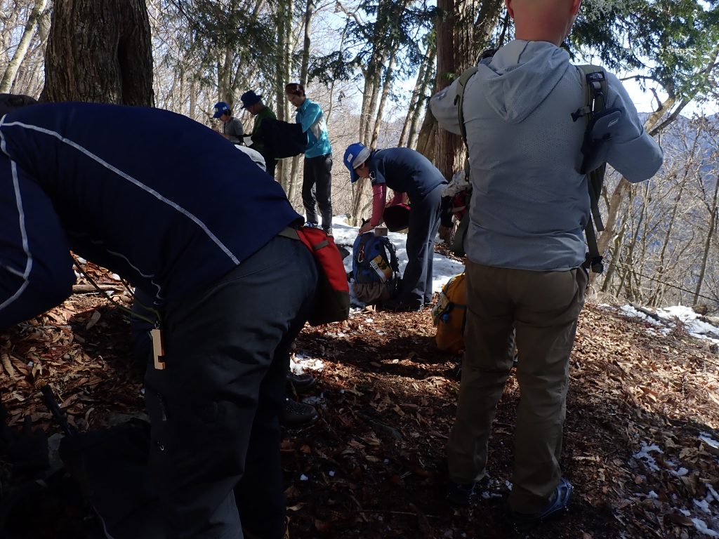 滝入ノ峰のトラバース手前でチェーンスパイクを装着。足場の狭いトラバースを通過する準備を整えます。