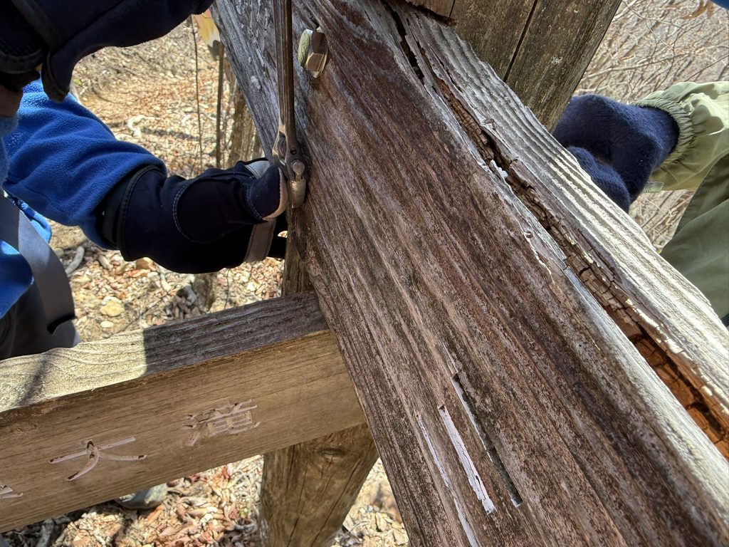 ボルト・ナットの増し締めをすると、支柱に食い込んでしまうものや道標がミシミシと音がするものもあり、経年劣化が進んでいると思われますが、破損には至っていません。