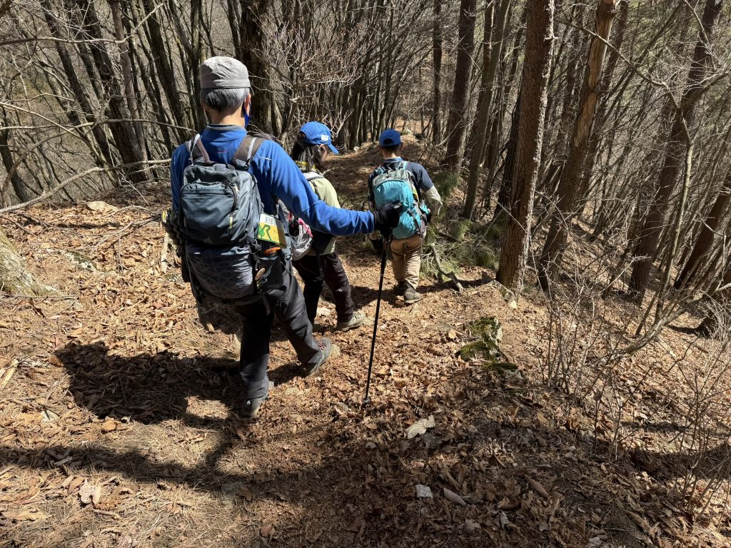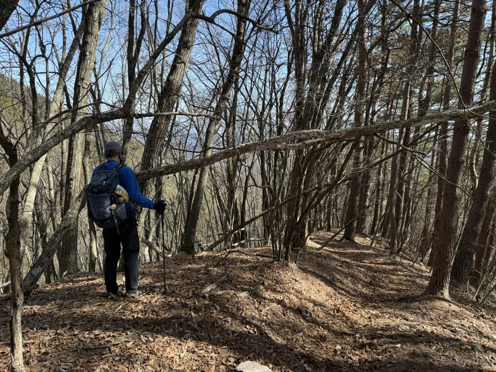 ほぼ、予定通り行動できています。登山道は写真のように十分な幅があるところだけでなく、崩落気味や幅が非常に狭いところもあり、落ち葉に隠れた石などがあるので、気を緩めずに歩きます。