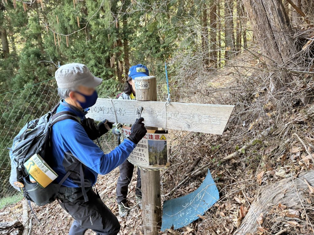 ここの道標は、木板にプレートをビス止めしたタイプなので、水拭きで清掃しておきました。