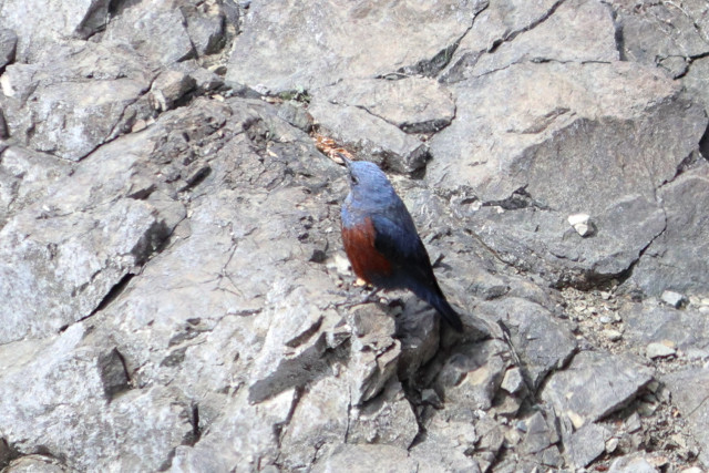 湖面に浮かぶブイの上に、カワウがずらっと並んでいるのを観察していると、イソヒヨドリの雄が現れました。